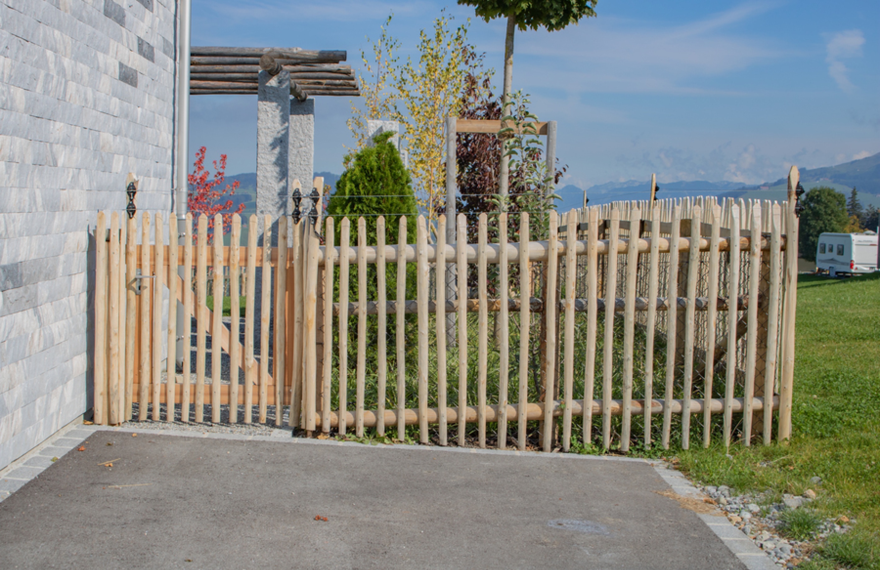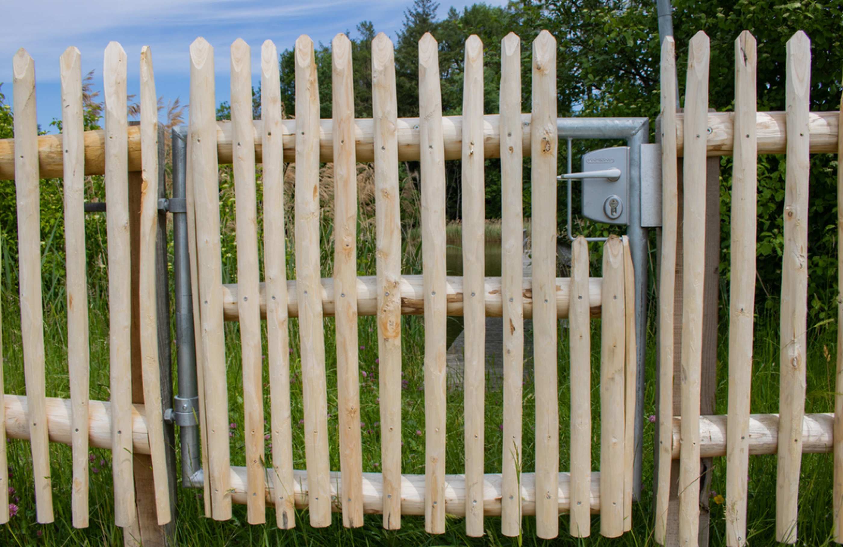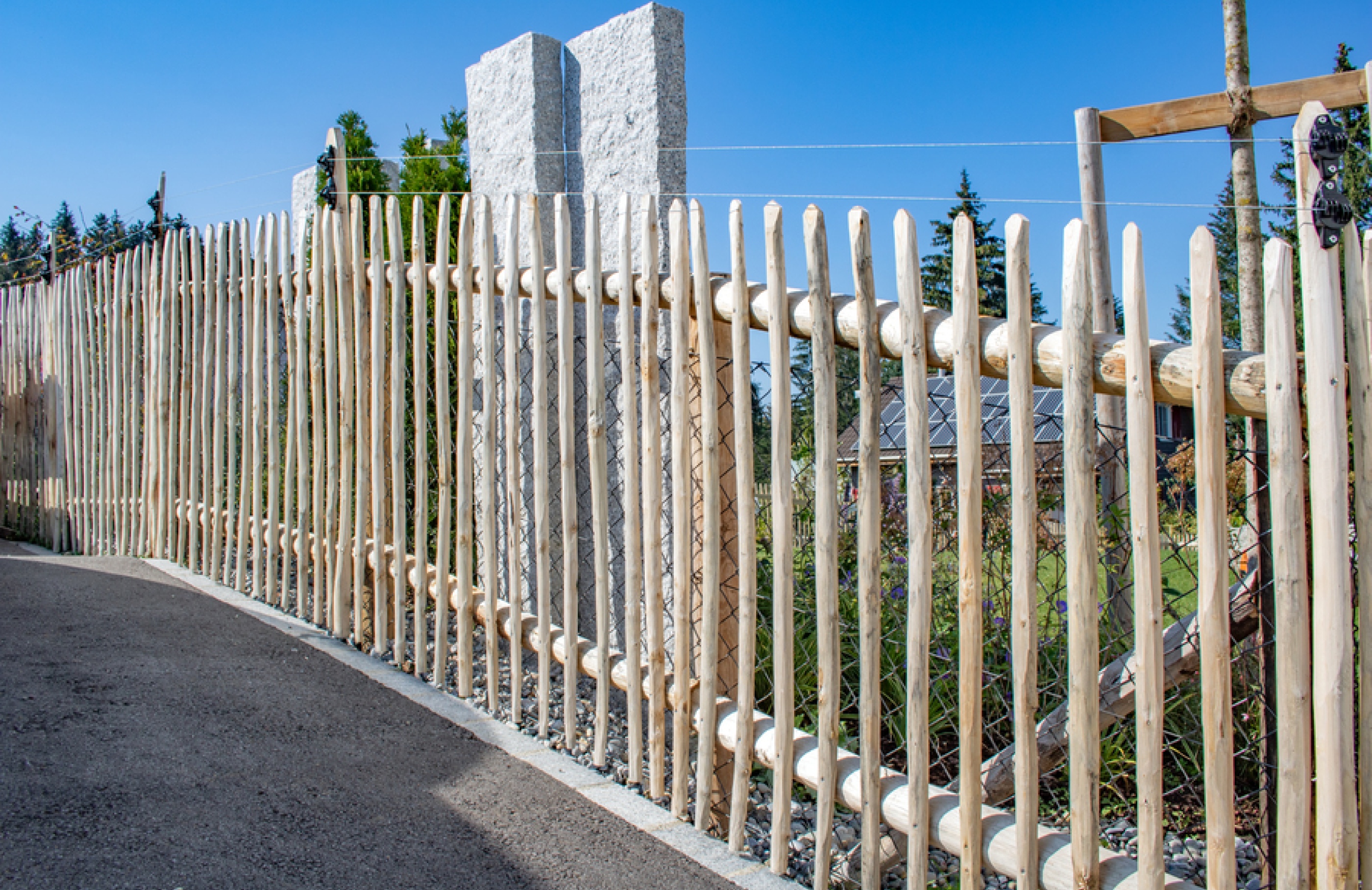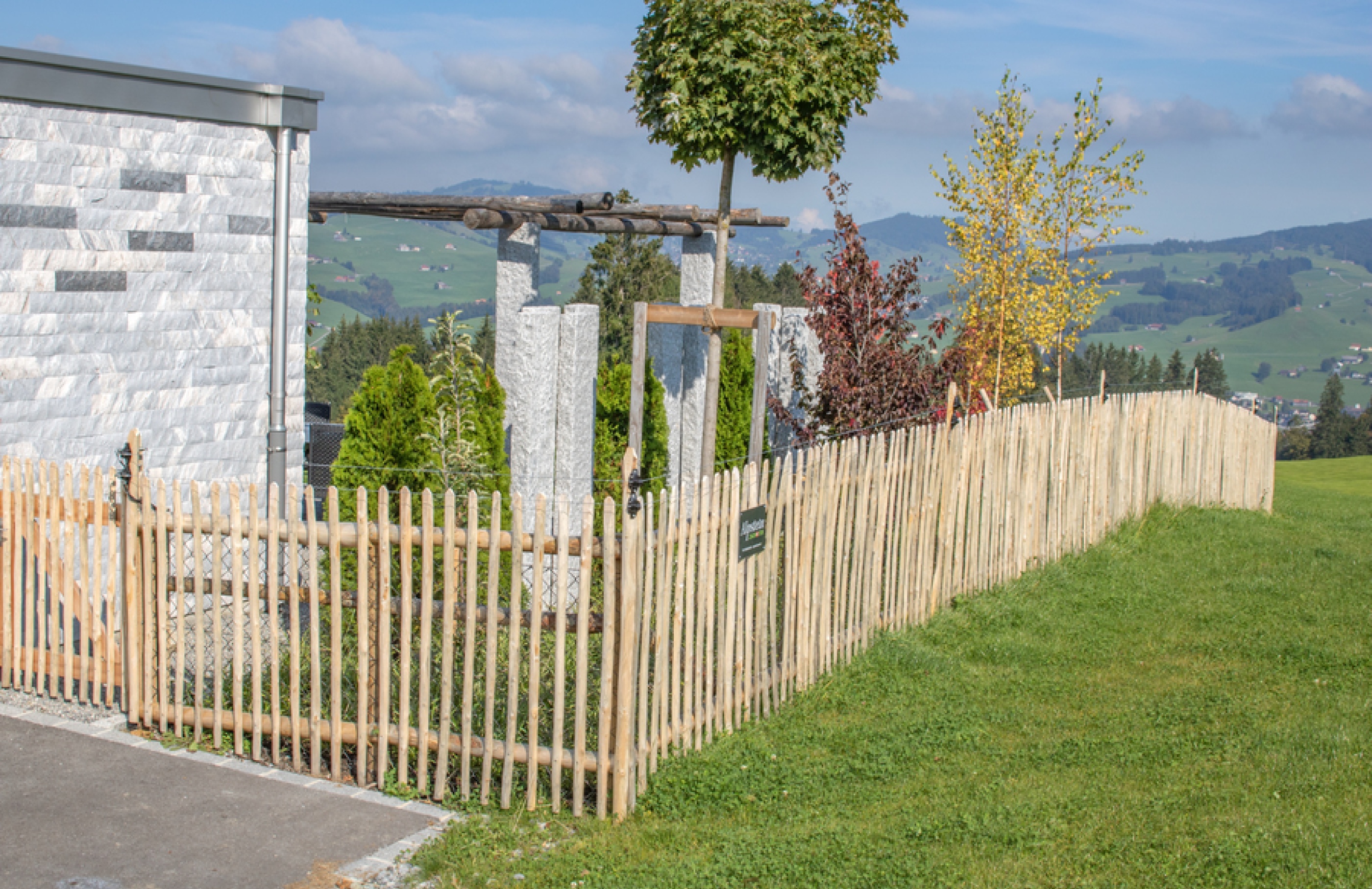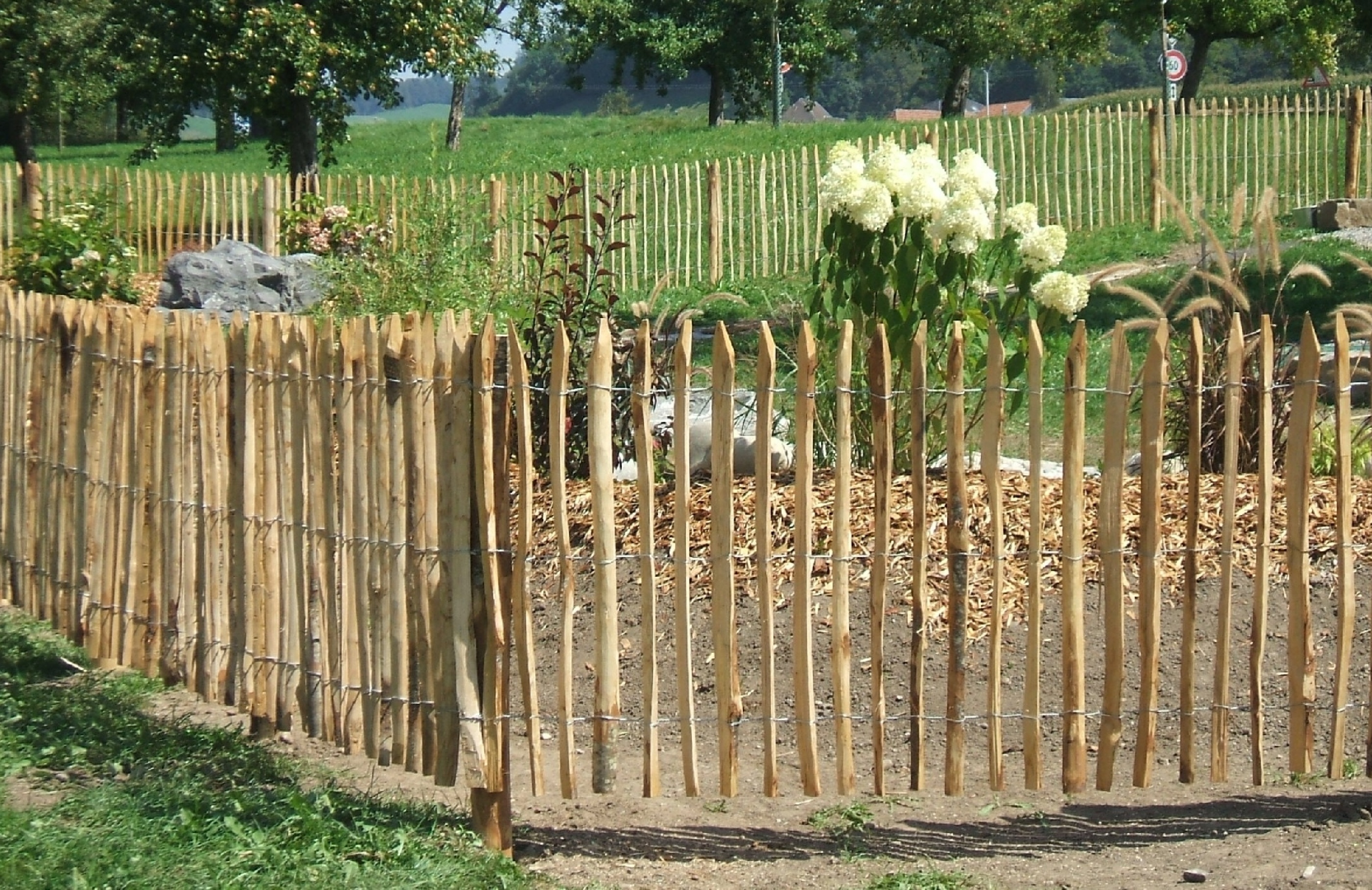 Der Kastanienzaun passt dank des rustikalen Erscheinungsbildes optimal in die natürliche Umgebung. Durch den von Natur aus hohen Gerbstoffanteil im Holz ist der Zaun äusserst widerstandsfähig gegen Feuchtigkeit und Pilzbefall. Die Pfähle aus Kastanienholz sind aufgrund ihrer natürlichen Eigenschaften umweltfreundlich, langlebig und pflegeleicht. Die charakteristische typisch warme Patina erhält der Kastanien-Staketenzaun mit den Jahren durch den Einfluss der Witterung.