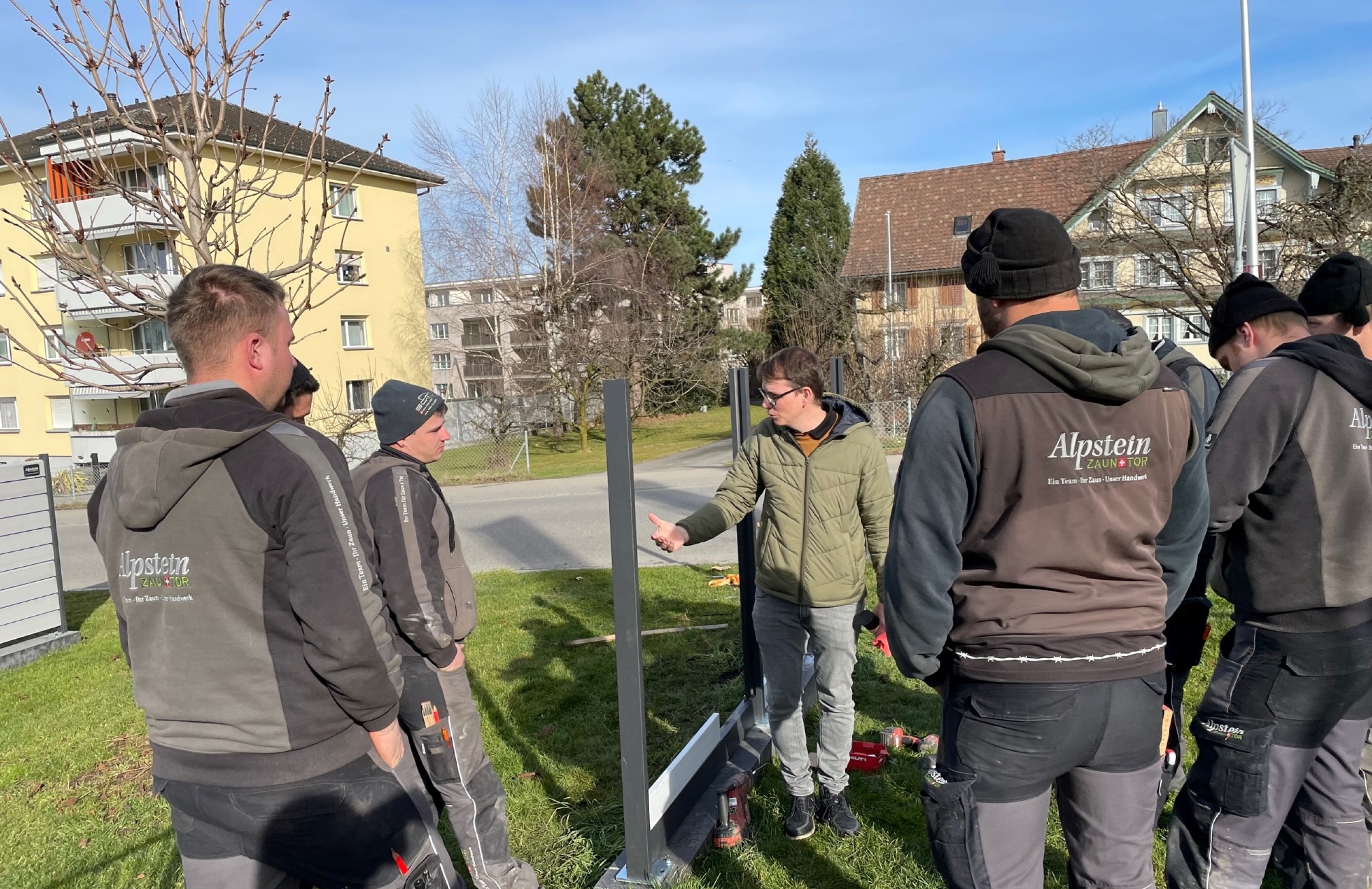 Unser Team wurde in zwei Gruppen aufgeteilt. Die eine Gruppe startete die Schulung mit Martin Hartmann von Deltatreu GmbH. Dort wurden verschiedene kleine Details der Sichtschutzwände erklärt und sogleich in unserem Mustergarten umgesetzt. Die andere Hälfte besuchte die Schulung von Ruedi und Cyrill, in der die Sichtschutzwände der Collection Hutter und Valu erklärt wurden.