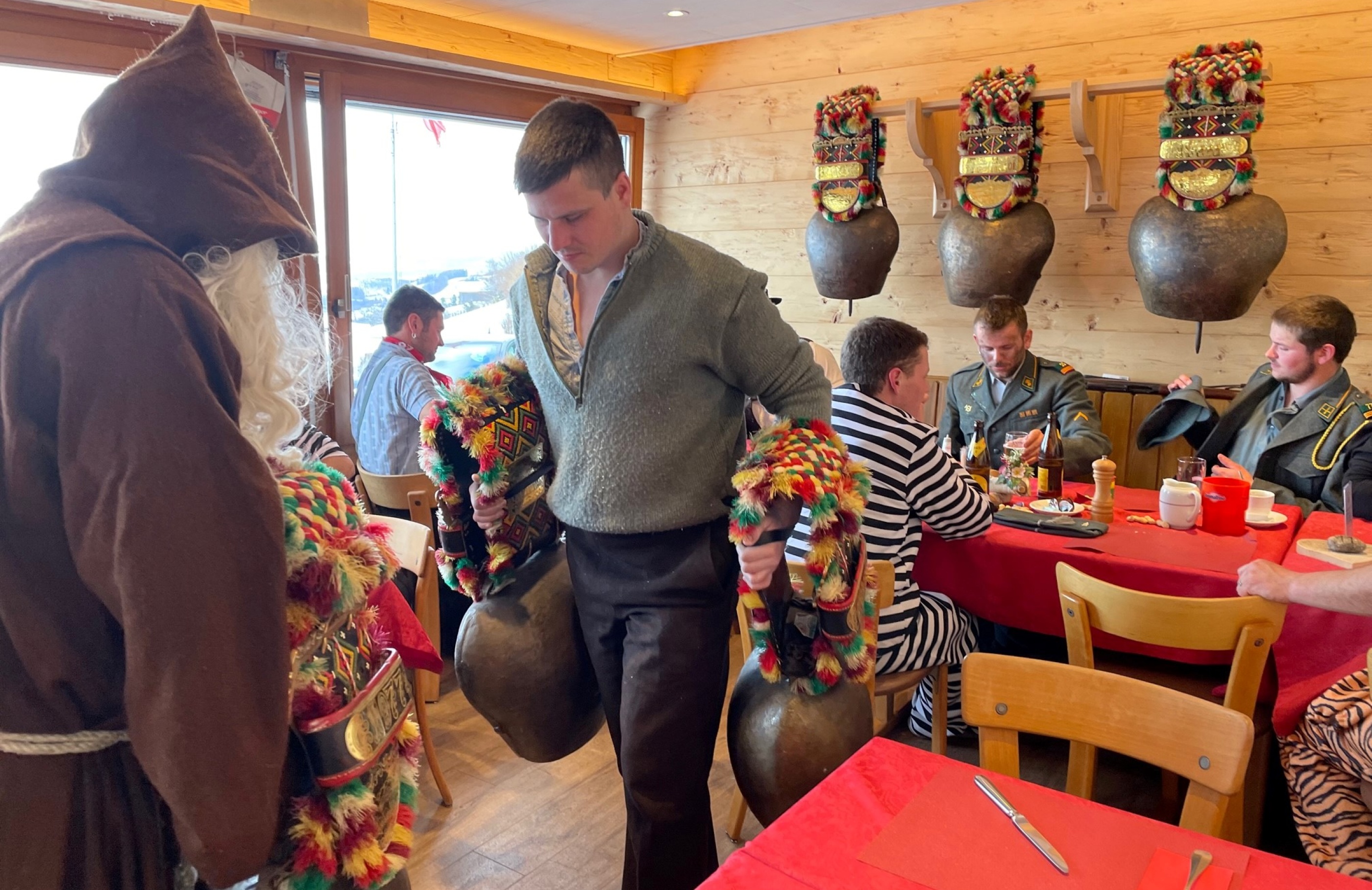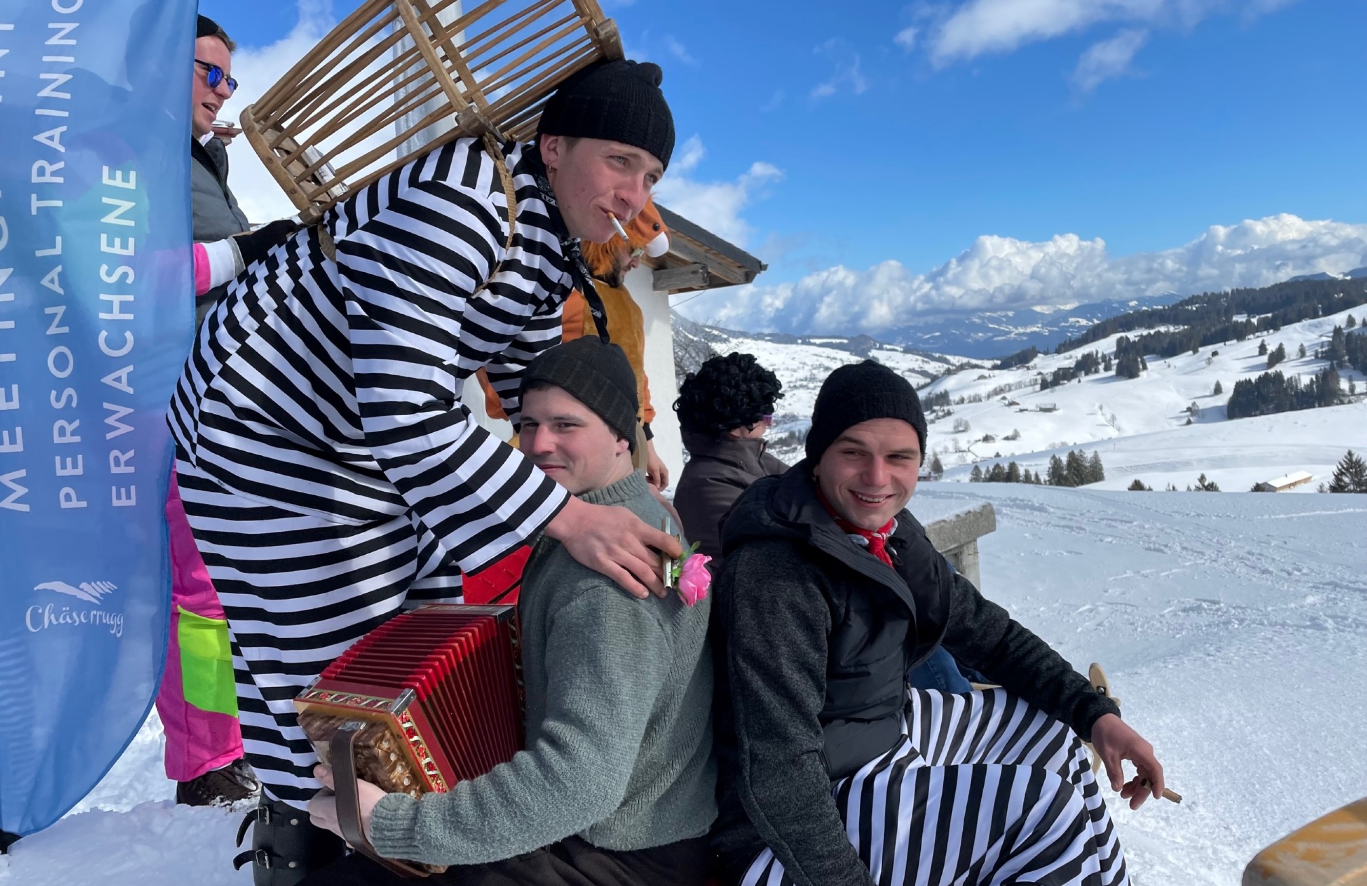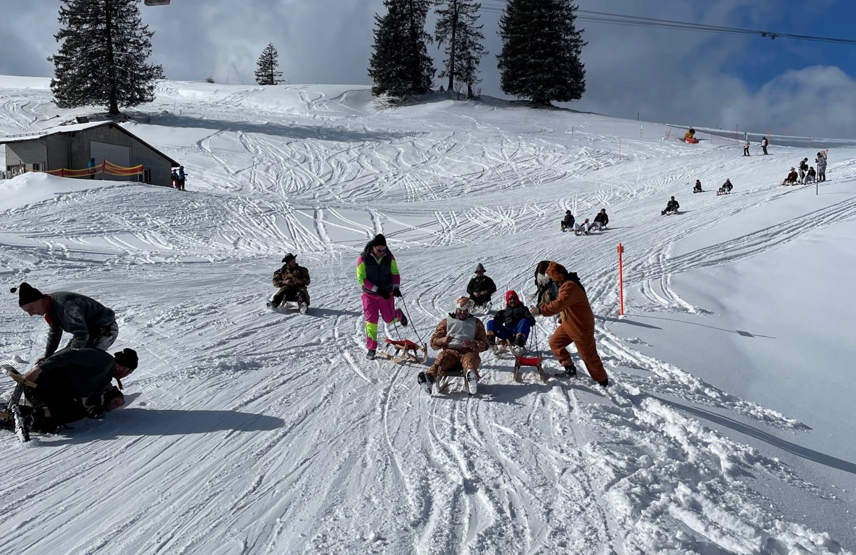 Den nächsten Tag starteten wir um 08:00 Uhr bei einem tollen Frühstück im Berghof Ganterschwil. Das Ziel war, dass sich jeder verkleidete und wir so zusammen noch ein wenig Fasnacht feiern konnten. Weiter ging unser Betriebsausflug in Richtung Toggenburg, genauer gesagt fuhren wir mit der Standseilbahn auf das Iltios. Dort fassten wir unsere Schlitten, die erste kurze Fahrt zur nächsten Bergbahn war rasant und es wurde viel gelacht. Mit der Gondel gings hoch hinaus zum Stöfeli. Die Hälfte der Gruppe fuhr sofort das erste Mal hinunter, das war ein riesiger Spass: Die Anderen gingen voraus ins Restaurant, sie wollten zauren und musizieren.