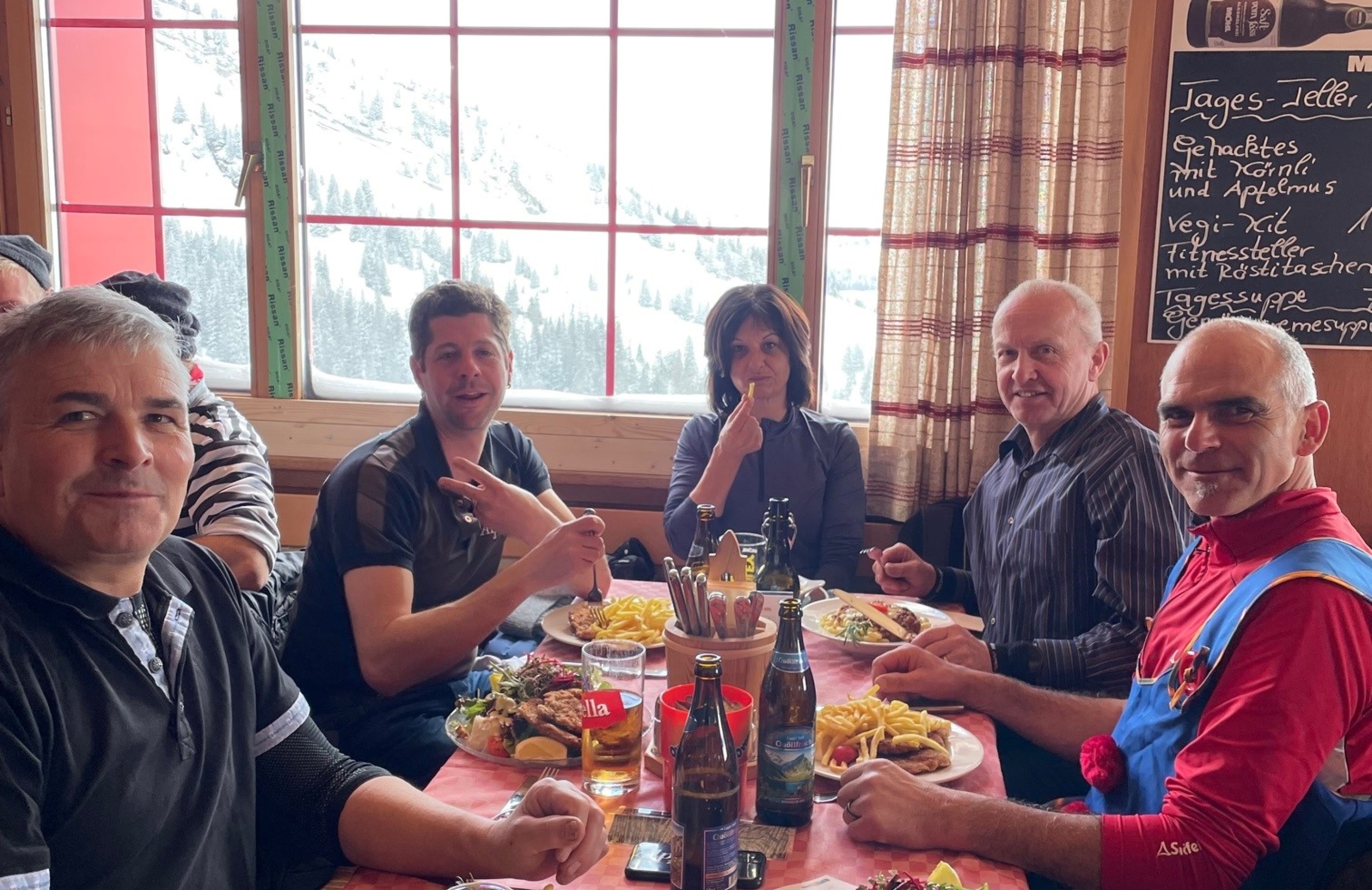 Zum Zmittag trafen wir uns dann wieder alle im Restaurant Stöfeli und genossen ein feines Mittagessen. Entweder wurde gejasst oder zusammen gezäuerlet, so ging der Nachmittag schnell zu Ende. Die Schlitten wurden wiederum gefasst und die rasante Fahrt Richtung Mittelstation stand uns nochmals bevor. Den tollen Teamausflug beendeten wir in einem nahegelgenen Restaurant.